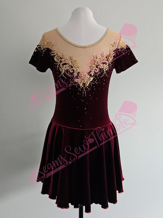 Wine Red Velvet Gold Floral Design Skating Dress - Women's size 8